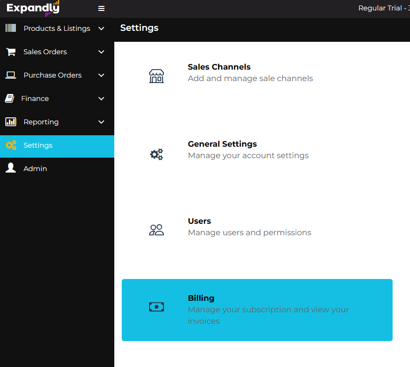 1. Either click (top centre) or select Settings (left menu) and then Billing: