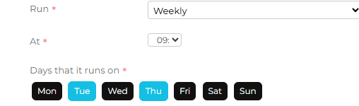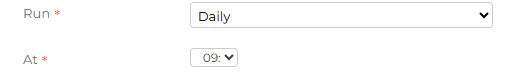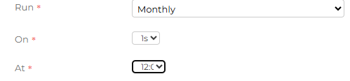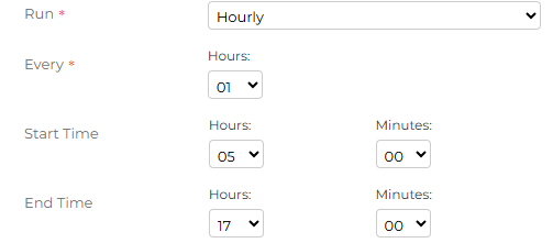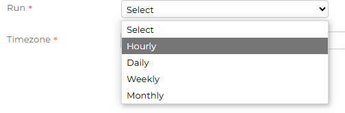 Run - this will determine when the CSV Scheduler job is going to run. Select from the drop-down for it to run either hourly, Daily, Weekly or Monthly and complete the additional frequency information, which will differ depending on the option chosen: