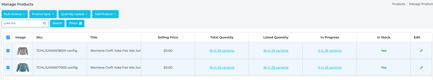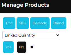 6. Once you have saved the manual link, you will be able to view linked products on your Manage Products page - These are identifiable by the linked icon , or alternatively you can apply a filter to show any 'Linked Quantity' that exist on your account: