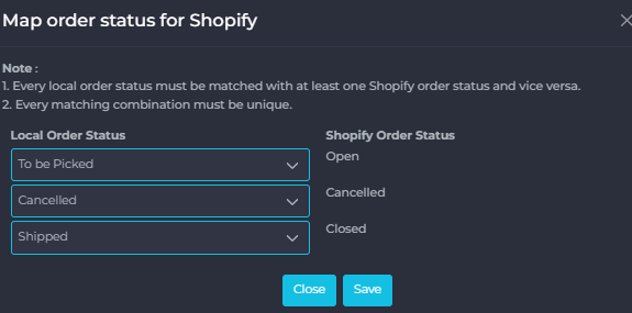 4. On the Map Order Status pop up, complete the required mapping, and once done, click