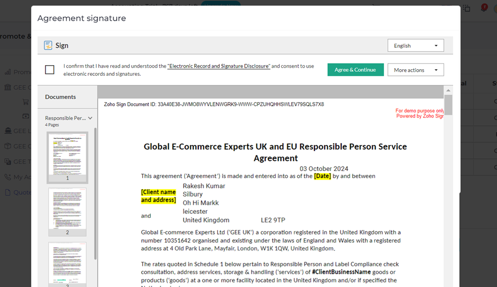 Please Note: in order for you to proceed with reviewing and signing the agreement, your business address details will need to be added to Expandly. You can add this by clicking on Settings (left nav pane)>General Settings