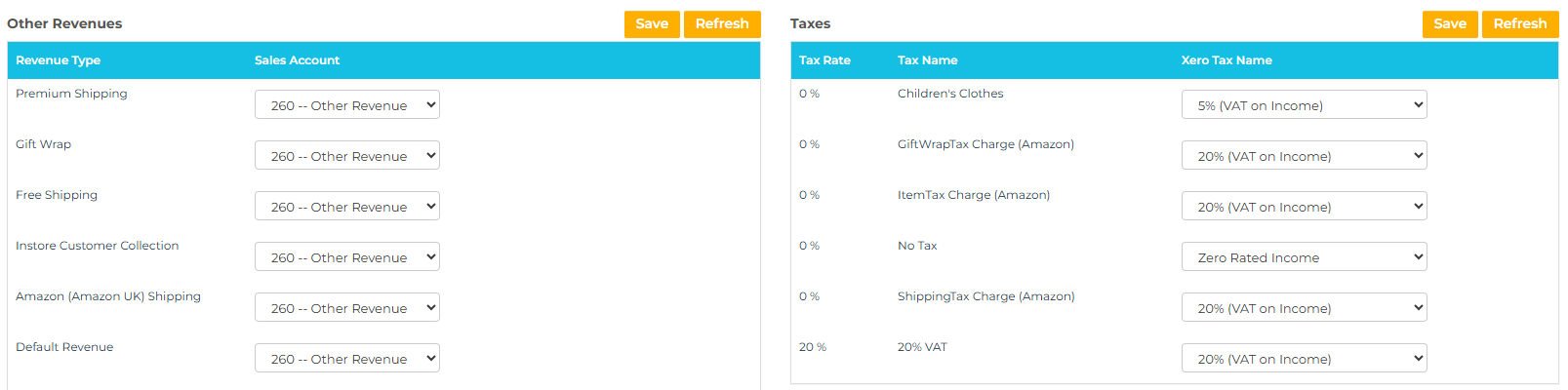 4. Further down the Configure Xero page, you will also be require to map your Other Revenue and Taxes by selecting the relevant Xero Account Type and Xero Tax Name in the drop-down boxes. Click (top right of both the Other Revenues and Taxes sections):