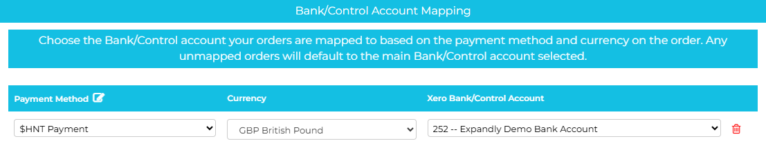 Bank/Control Account - will allow you to select the default bank account in Xero. Also, by clicking on the edit icon, gives you the ability to map individual payment method with different bank accounts, including your asset (also known as control, suspense or contra) account: