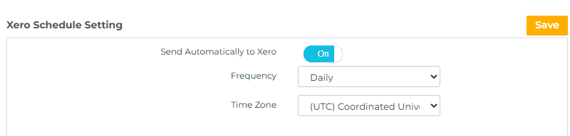 1. On the Configure Xero page scroll to the bottom and within the Xero Schedule Setting section, click the 'Send Automatically to Xero' to and use the drop-down box to select your preferred frequency (Daily, Weekly or Monthly) and Time Zone: