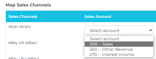 Sales Account - select the sales account you want your orders to go to, per sales channel: