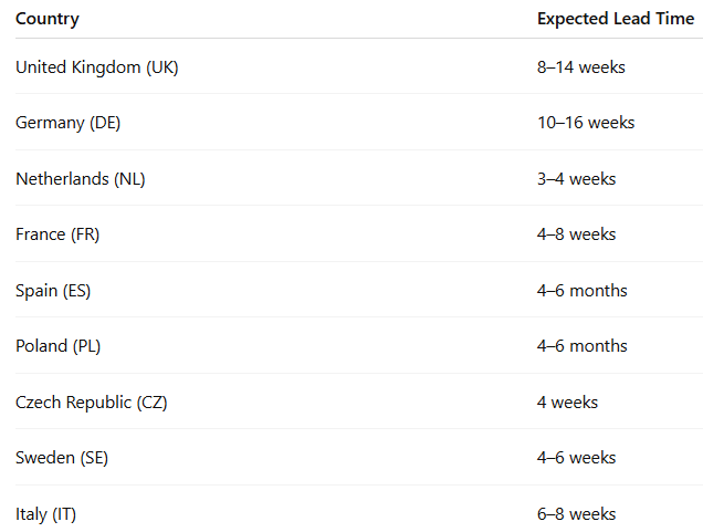 Overview This guide outlines the estimated lead times for EPR completions by Category and Country. ⚠️ Please Note: Lead times may fluctuate depending on the capacity of local authorities and timely payment of registration invoices. Some authorities ...